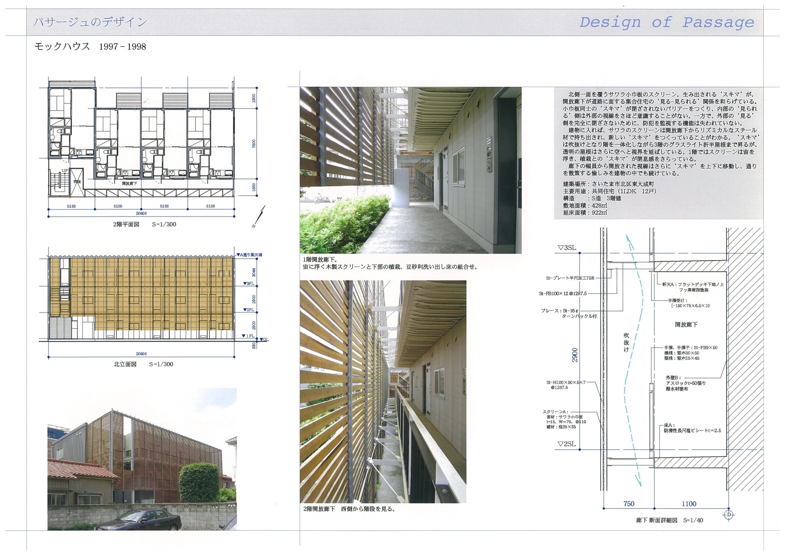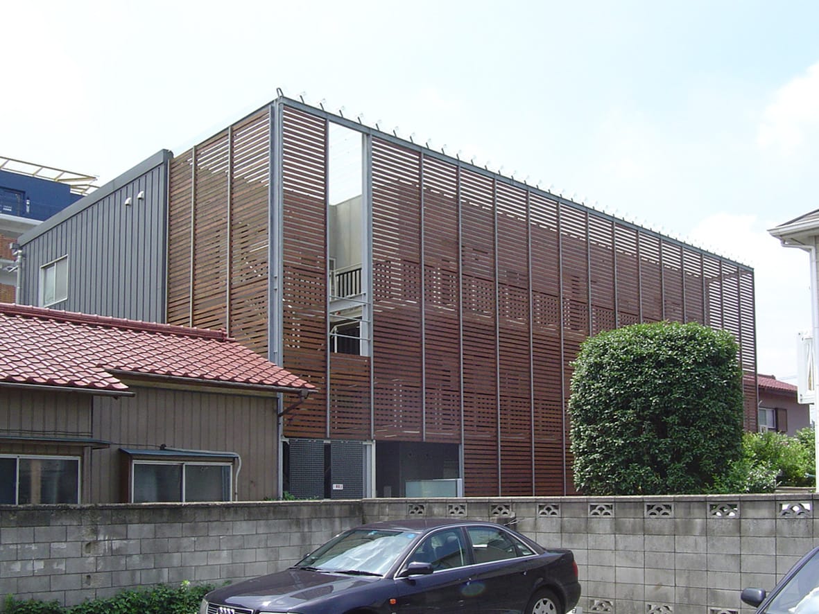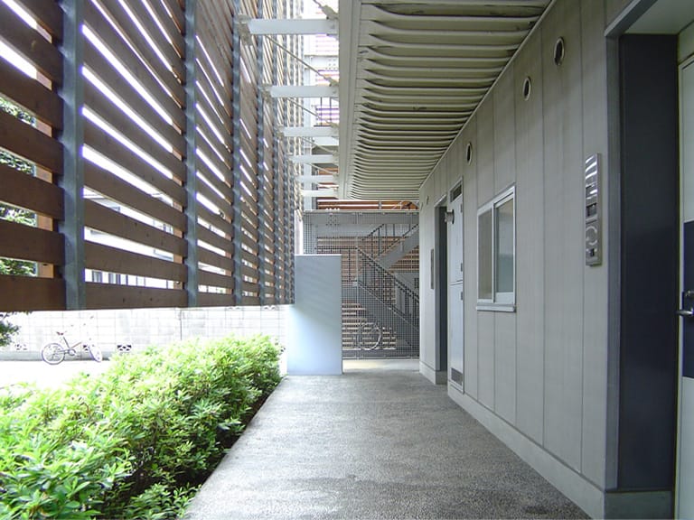 鉄骨3階建て12戸の集合住宅である。一般的な平面であるが、北側開放廊下と近隣との視線の交錯を避けるため、北側一面を覆うサワラ小巾板のスクリーンを設置した。