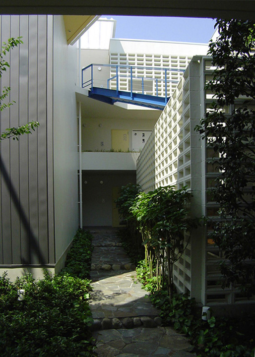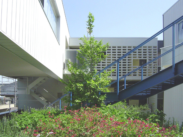 住居はいうまでもなく都市と関連している。このアパートの階段、通路は都市につながる立体街路として仕掛けられている。都市から階段、通路、そして彼の住戸へとの連続に回遊性、幅員の変化、適度な分節、上空への解放性などが意図されている。それらの中心に屋上庭園があり、そこに斜行する階段に彩色されたブルーは楽園から天空への憧憬を表現する。それらは3層に重層して樹木や、草花、虫たちと共に無機質な都市の迷宮の中で濃密な意味を持ち、世界における私たちの生のありかたそのものを形成する場となる。