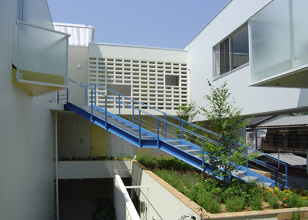 このアパートの階段、通路は都市につながる立体街路として仕掛けられている。都市から階段、通路そして住戸へとの連続に回遊性、幅員の変化、適度な文節、上空への開放性などが意図されている。それらの中心に屋上庭園があり、そこに斜行する階段に彩色されたブルーは楽園から天空への憧憬を表現する。