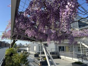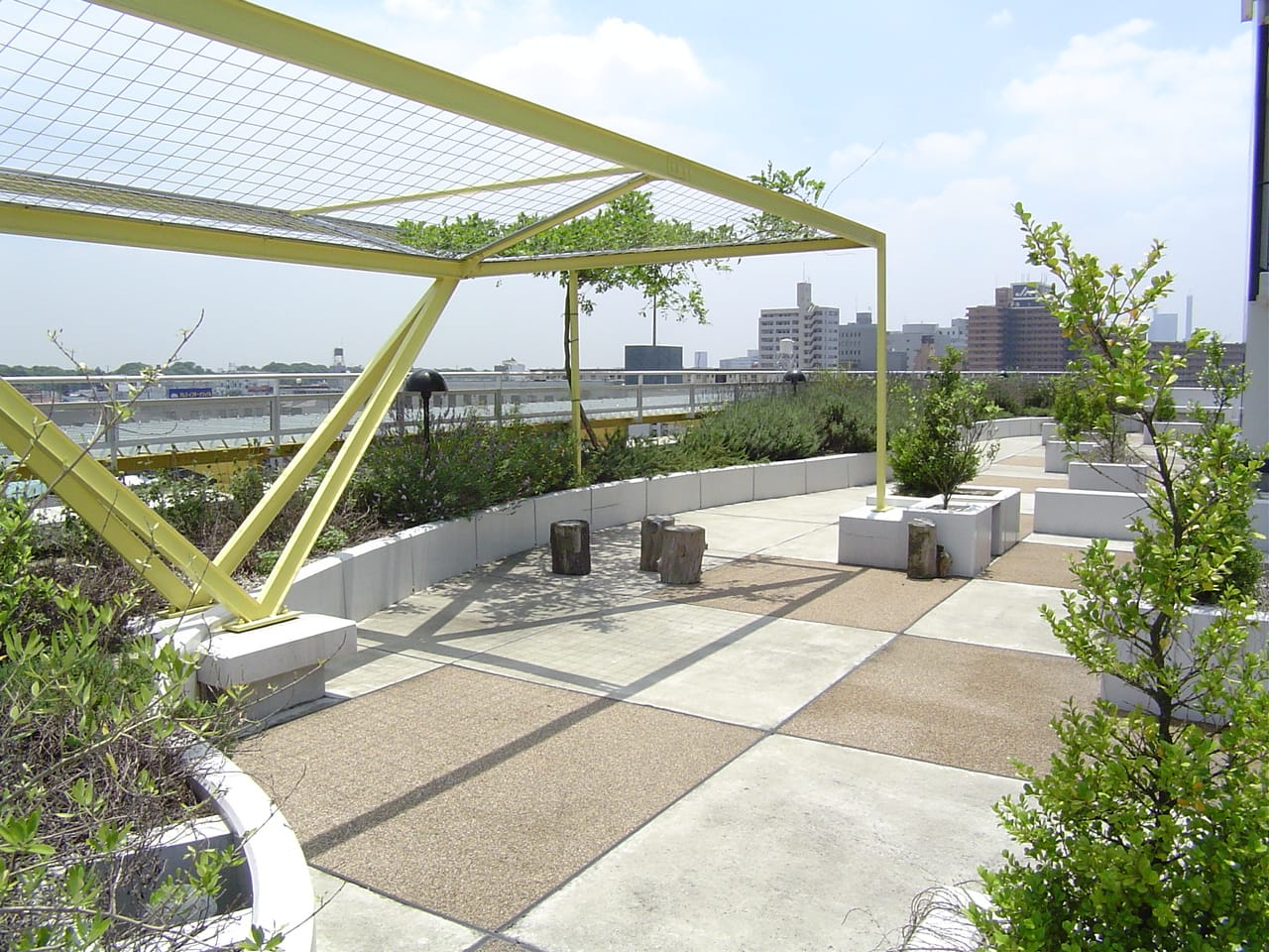 先代の頃この土地はサクラ林であったという。敷地北側駐車場には、ツタのパーゴラを設え、低層部の屋上にはハーブガーデンを設け。また西側道路面には、サクラの木を並列に植えた。可能な限り現代的な解釈において、都市の緑空間を提案した。
