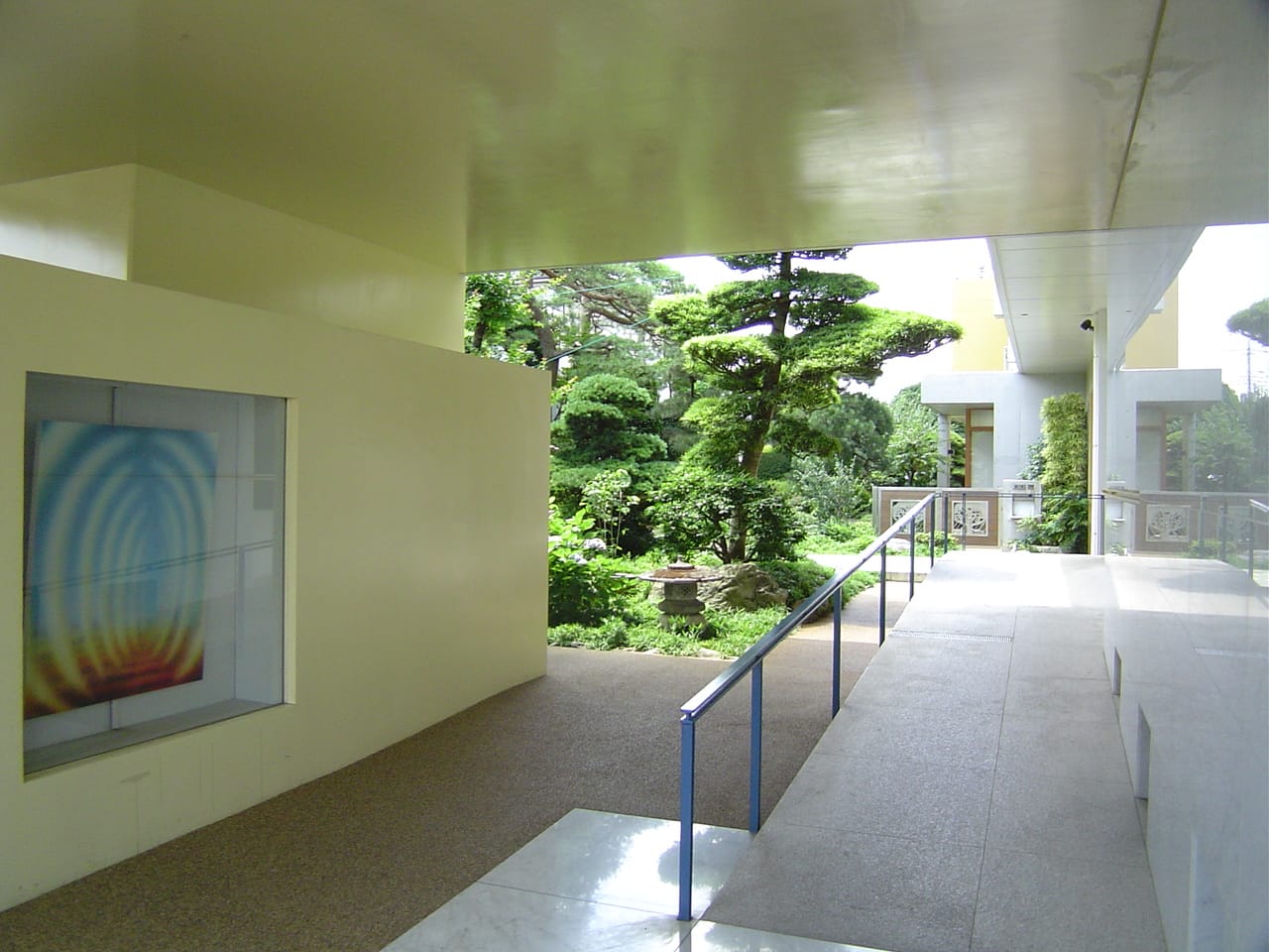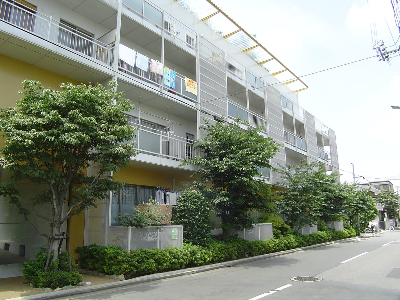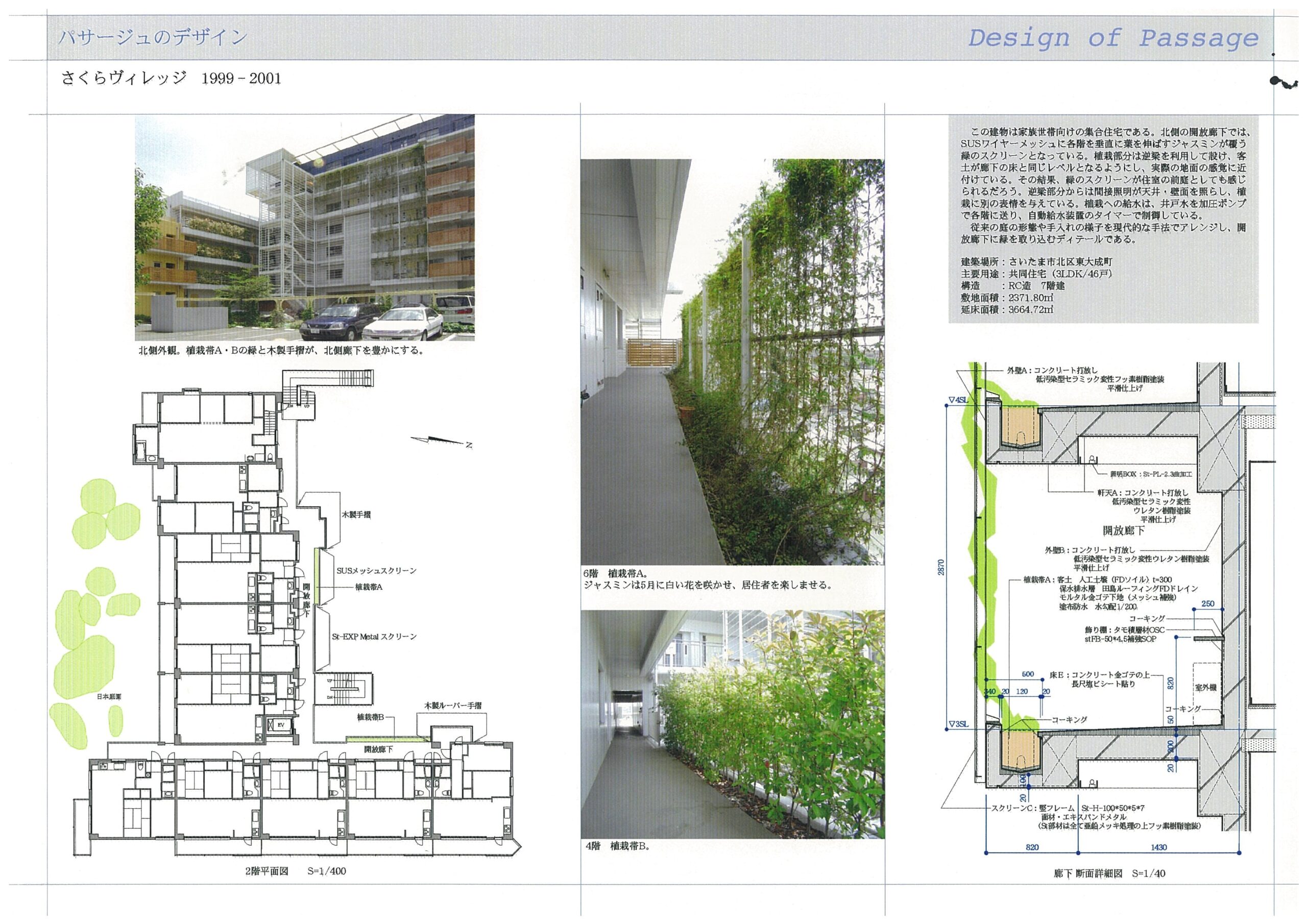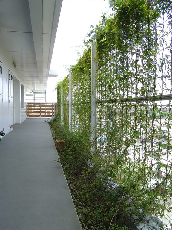 この建物は家族世帯向けの集合住宅である。北側の開放廊下でSUSワイヤーメッシュに垂直に葉を伸ばすジャスミンを各階に植え、覆緑のスクリーンとなっている。植栽部分は逆梁を利用して設け、土が廊下の床と同じレベルとなるようにし、実際の地面の感覚に近づけている。その結果、緑のスクリーンが住戸の前庭としても感じられるだろう。逆梁部分からは間接照明が天井・壁面を照らし、植栽に別の表情を与えている。植栽への給水は、井戸水を加圧ポンプで各階へ送り、自動給水装置のタイマーで制御している。従来の庭の形態や手入れの様子を現代的な手法でアレンジし、開放廊下に緑を取り組むディテールである。