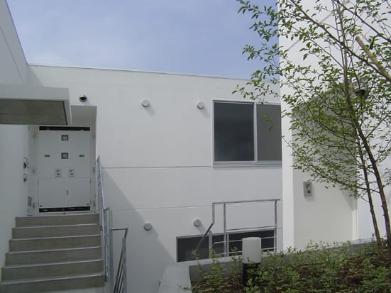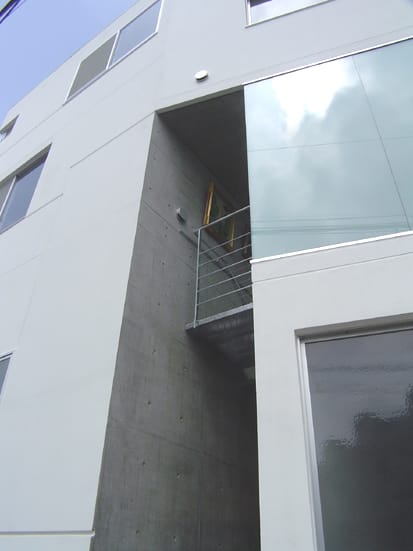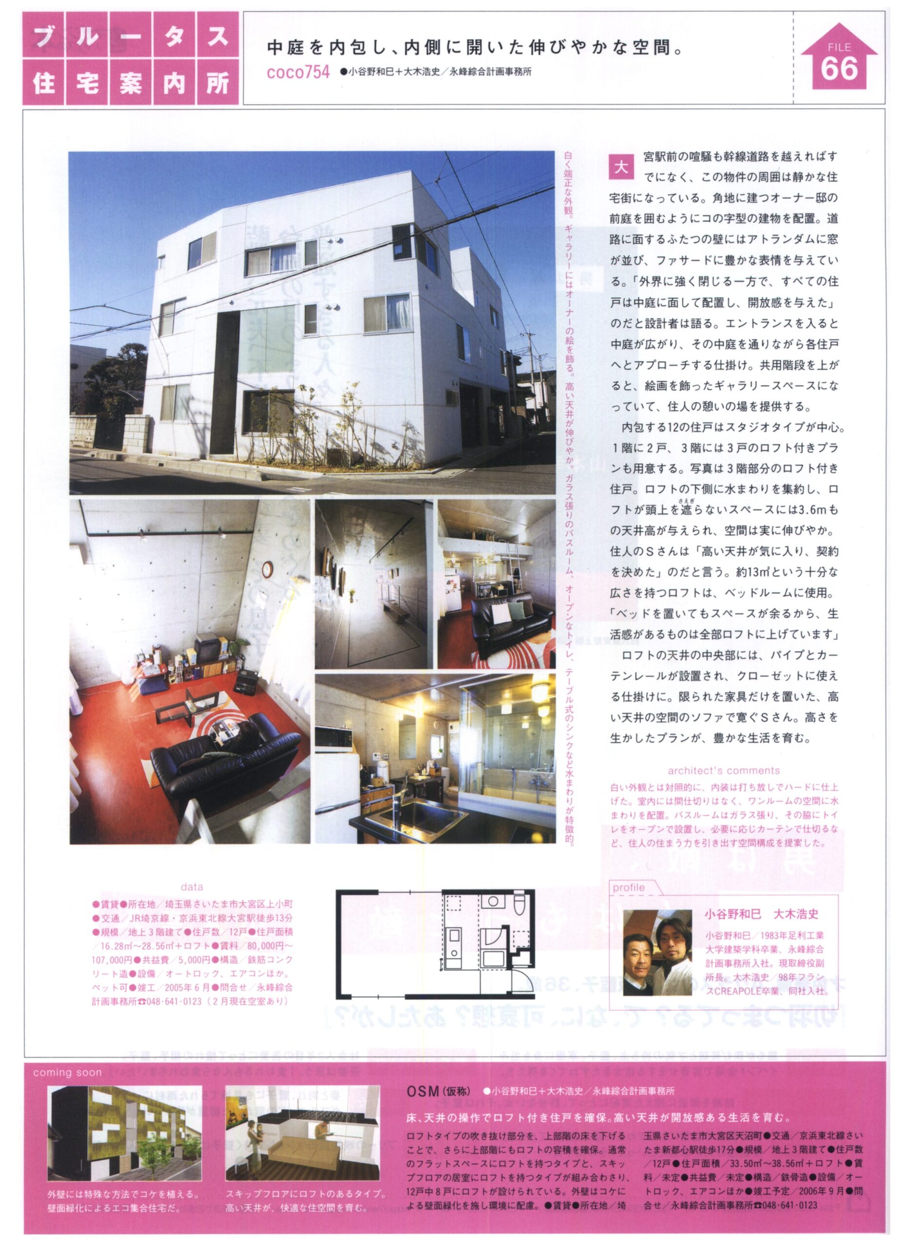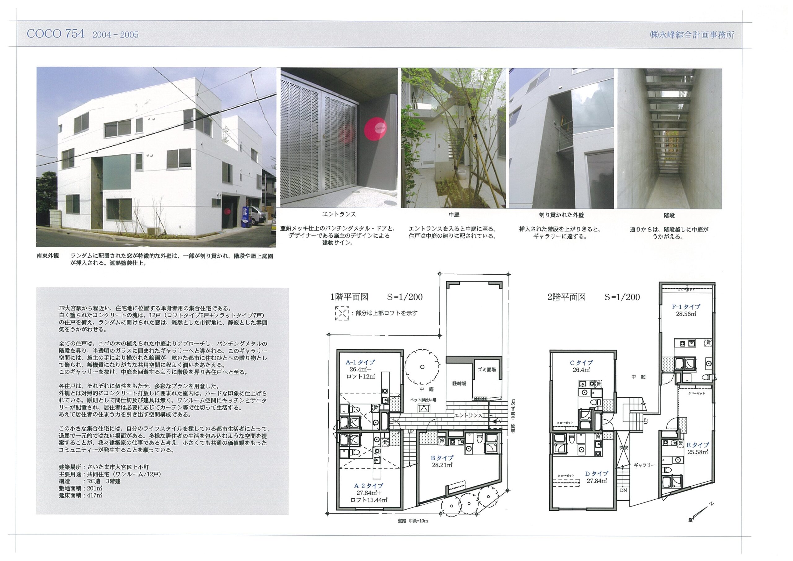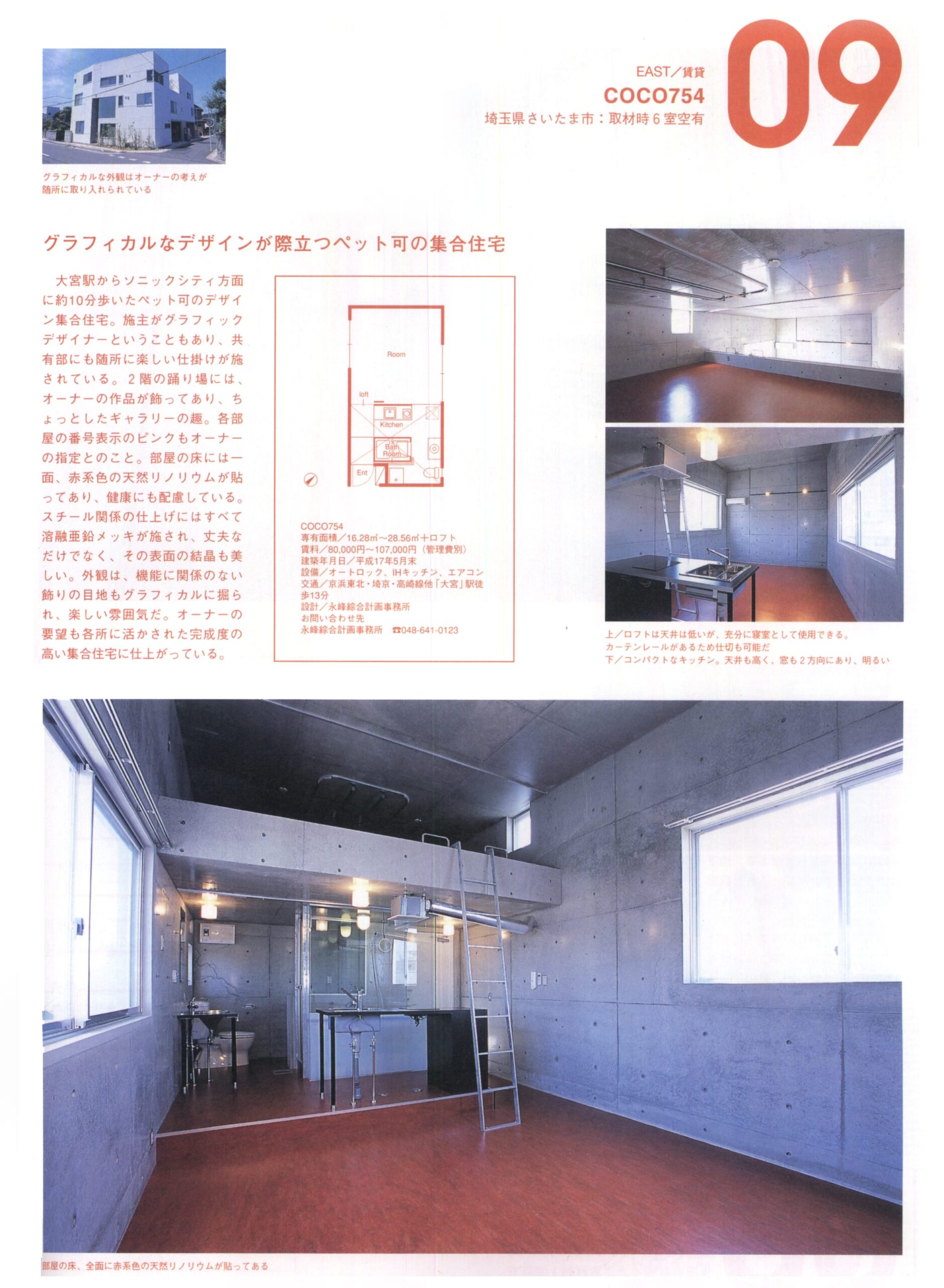 大宮駅からソニックシティ方面に約10分歩いたペット可のデザイン集合住宅。施主がグラフィックデザイナーということもあり、共有部にも随所に楽しい仕掛けが施されている。2階の踊り場には、オーナーの作品が飾ってあり、ちょっとしたギャラリーの趣。各部屋の番号表示のピンクもオーナーの指定とのこと。部屋の床には一面、赤系色の天然リノリウムが貼ってあり、健康にも配慮している。スチール関係の仕上げにはすべて溶融亜鉛メッキが施され、丈夫なだけでなく、その表面の結晶も美しい。外観は、機能に関係のない飾りの目地もグラフィカルに掘られ、楽しい雰囲気だ。オーナーの要望も各所に生かされた完成度の高い集合住宅に仕上がっている。
