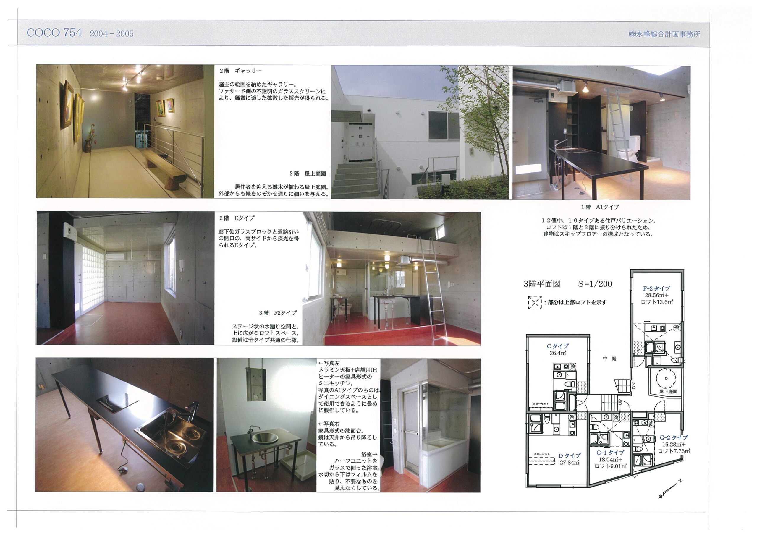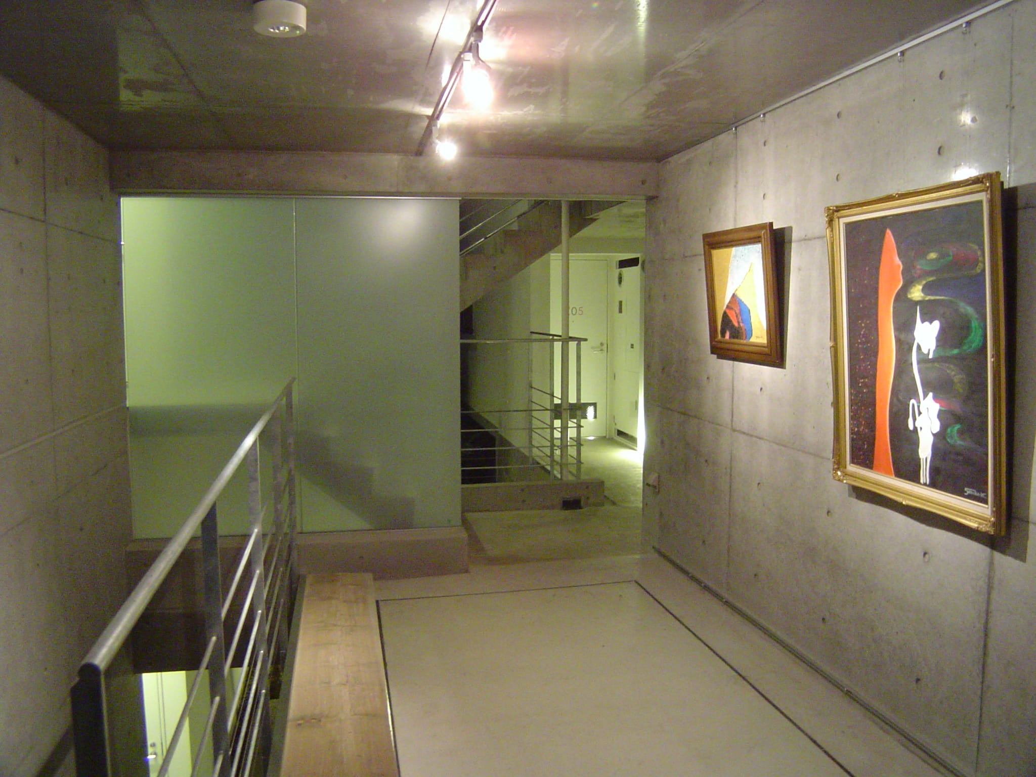 この条件の下、グラフィックデザイナーであったオーナーの希望から、共用廊下に絵画ギャラリーを設けた。また住戸内にロフトを設けるため、5つのフロアレベルとなり、階段スペースは絵画や中庭を眺めながら上がる楽しい空間となった。住戸内では、水回りスペースが舞台のように一段あがり、居室との壁はなく開放的にした。