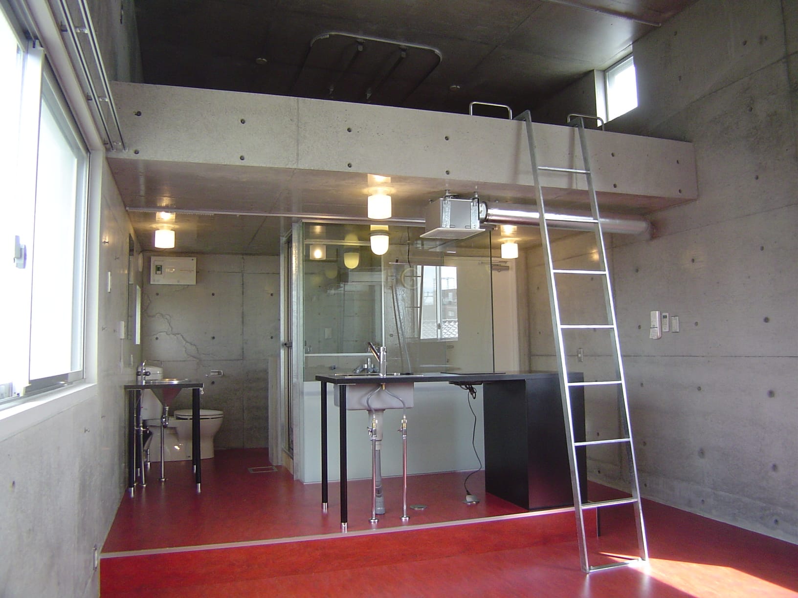 白い外観とは対照的に、内装は打ち放しでハードに仕上げた。室内には間仕切りはなく、ワンルームの空間に水まわりを配置。バスルームはガラス張り、その脇にトイレをオープンで設置し、必要に応じカーテンで仕切るなど、住人の住まう力を引き出す空間構成を提案した。