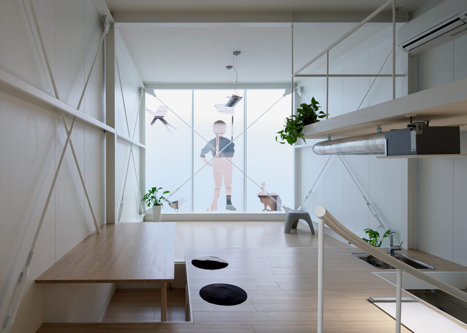 天井高の低い3つの動作空間(天井高1.65Mの1階ベットスペース、天井高2.1Mのキッチン、1.3Mのロフト)を重ね、螺旋階段を中心に他の動作空間をスキップフロア状に配置した。それぞれの空間が壁で仕切られない、連続性のある立体的なワンルームとなっている。