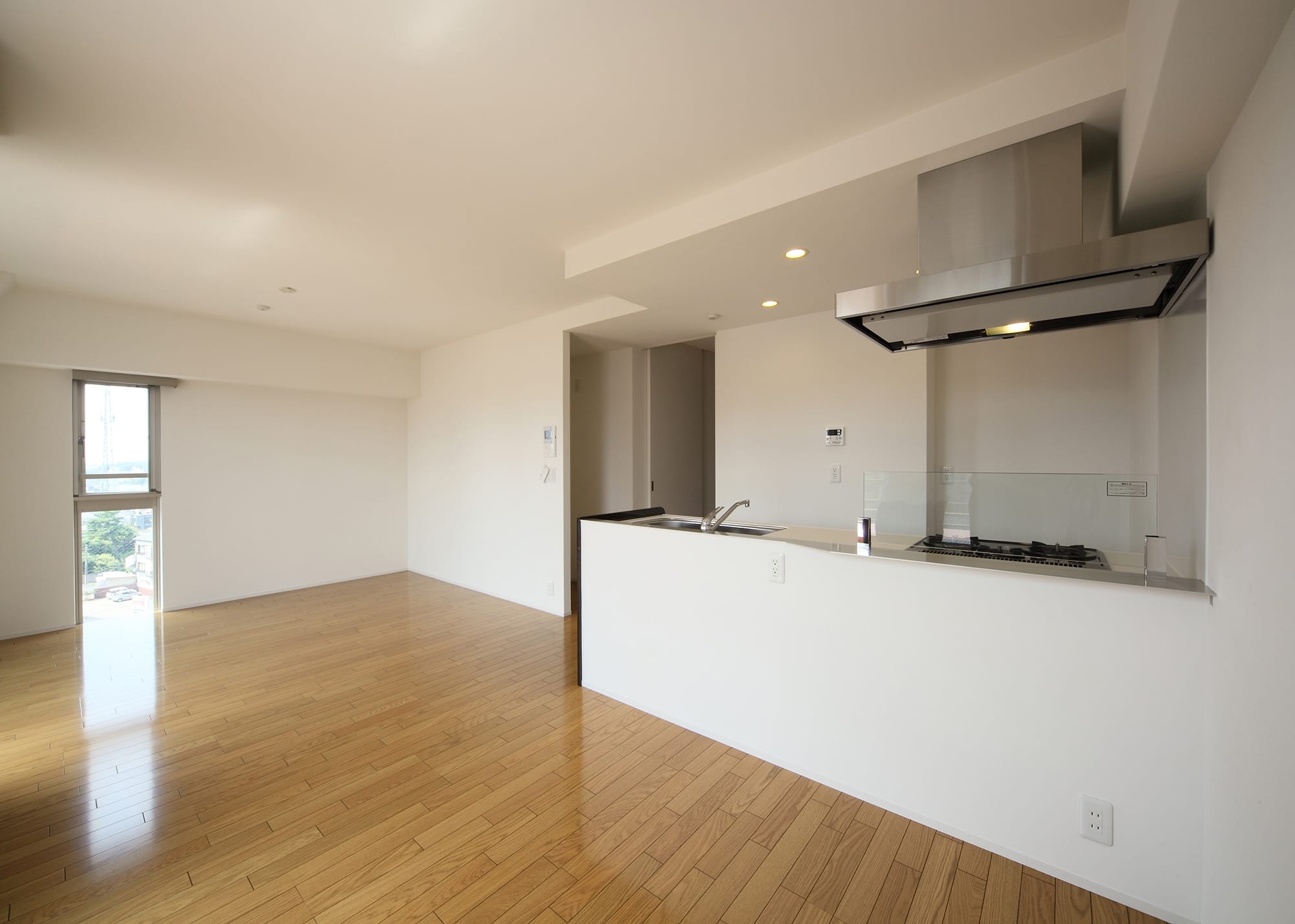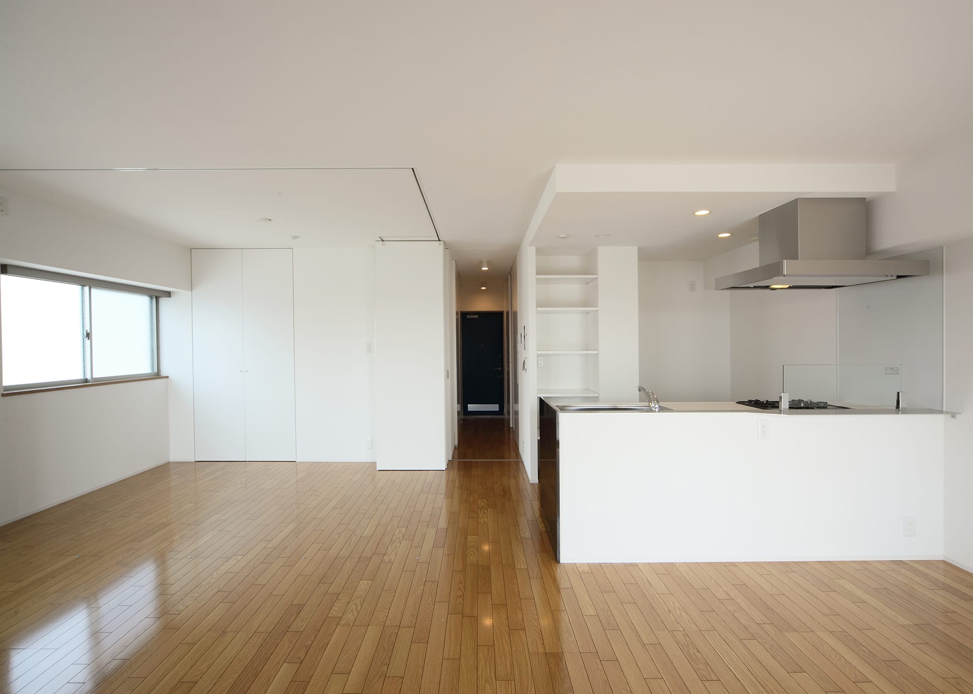3LDKタイプでは、隣接する2つの個室とLDKとが可動パーテーションによって間仕切られ、それらを開け放てば一体的な空間としても利用できる。空間をゆるやかに仕切ることで、幅広い家族構成に対応している。室内は白を基調に、高さを押さえた巾木、窓/ドア枠を極力廃したシンプルな納まりなど、入居者の暮らしのキャンバスとなるように工夫されている。