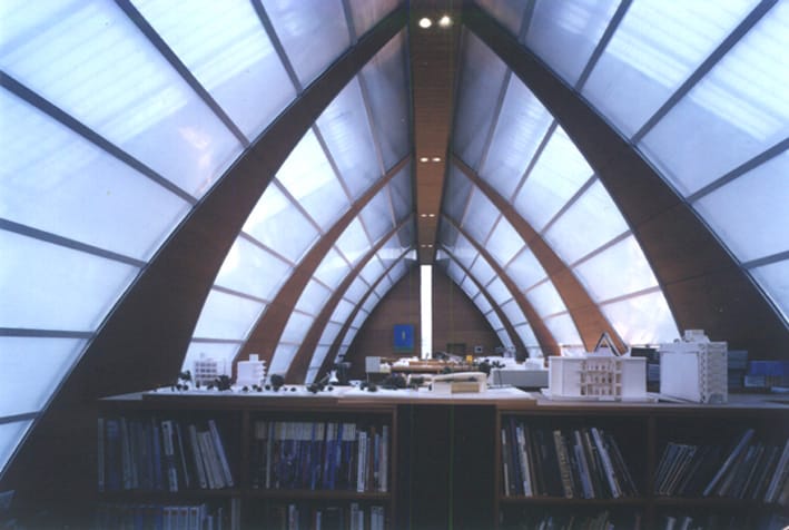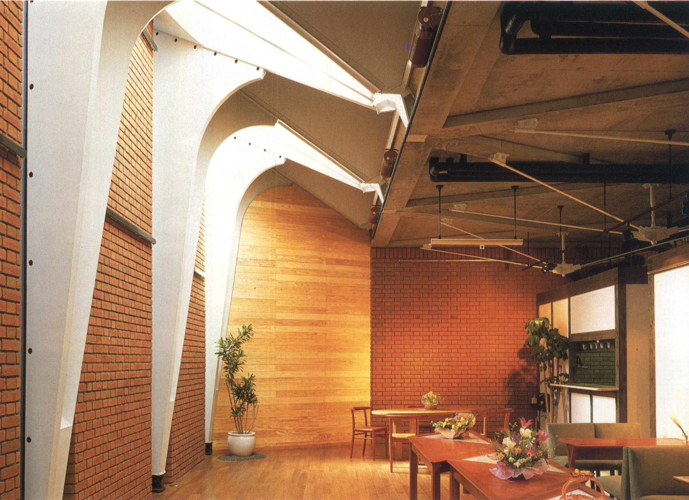 アーチで囲まれた空間はガラス屋根で覆われ、2階の壁はかわるがわるに光の壁と木造の壁となり、屋根からの光は1階に降りそそぎ、レンガの壁面に反射して、不思議な陰影とリズミカルな空間をつくりあげている。