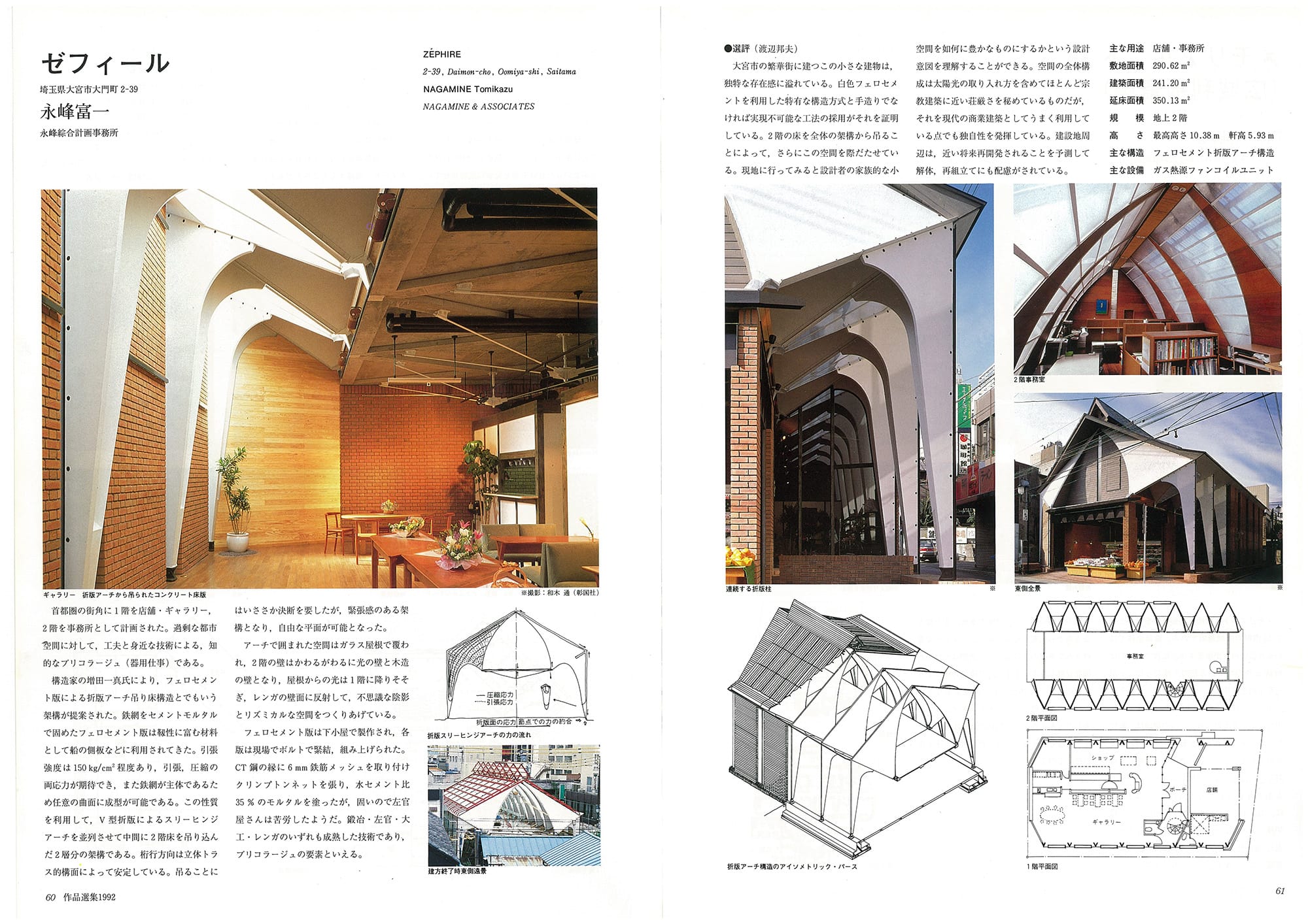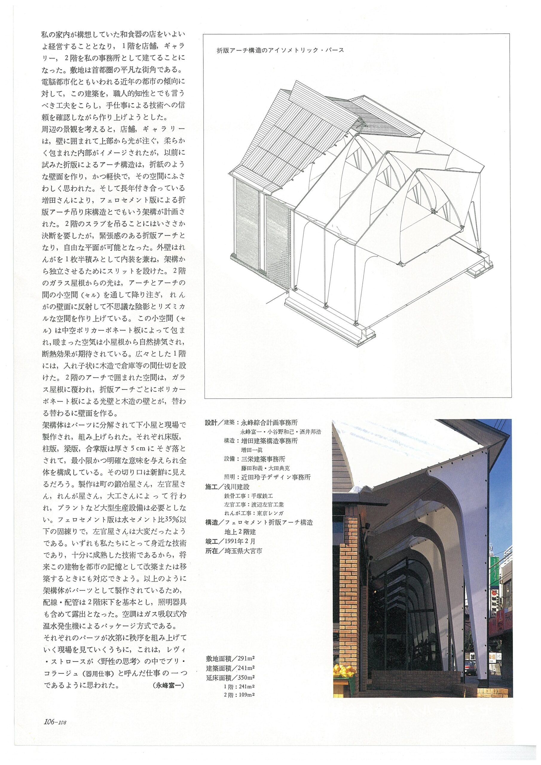 大宮市の繁華街に建つこの小さな建物は、独特な存在感に溢れている。白色フェロセメントを利用した特有な構造方式と手造りでなければ実現不可能な工法の採用がそれを証明している。2階の床を全体の架構から吊ることによって、さらにこの空間を際だたせている。現地に行ってみると設計者の家族的な小空間を如何に豊かなものにするかという設計意図を理解することができる。空間の全体構成は太陽光の取り入れ方を含めてほとんど宗教建築に近い荘厳さを秘めているものだが、それを現代の商業建築としてうまく利用している点でも独自性を発揮している。建設地周辺は、近い将来再開発されることを予測して解体、再組立てにも配慮がされている。