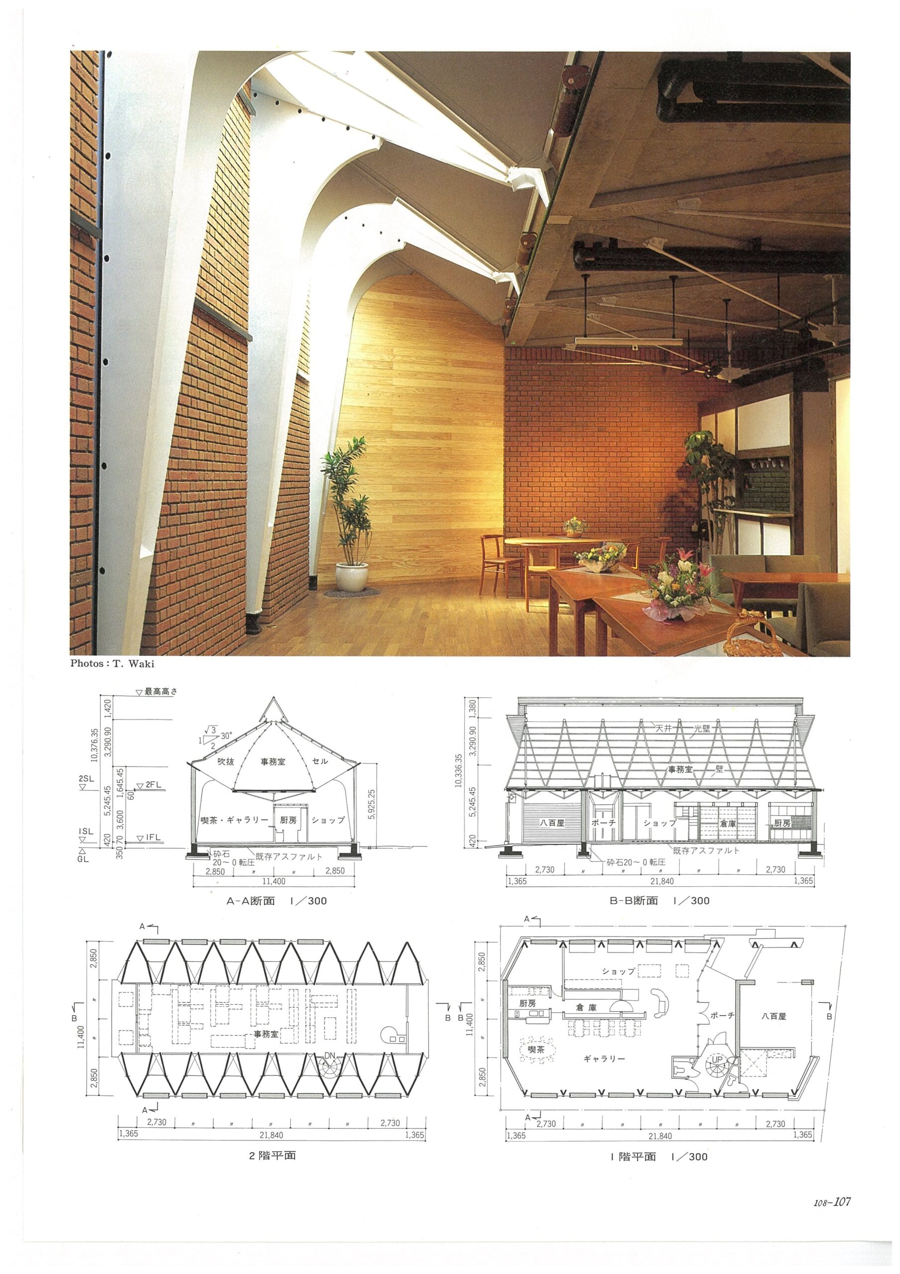 周辺の景観を考えると、店舗、ギャラリーは壁に囲まれて上部から光が注ぐ、柔らかく包まれた内部がイメージされたが、以前に試みた折版によるアーチ構造は、折り紙のような壁面を作り、かつ軽快で、その空間にふさわしく思われた。そして長年付き合っている増田さんにより、フェロセメント版による折版アーチ吊り床構造とでもいう架構が計画された。2階のスラブを吊ることにはいささか決断を要したが、緊張感のある折版アーチとなり、自由な平面が可能となった。外壁はれんがを一枚半積みとして内装を兼ね、架構から独立させるためにスリットを設けた。2階のガラス屋根からの光は、アーチとアーチの間の小空間(セル)を通して降り注ぎ、れんがの壁面に反射して不思議な陰影とリズミカルな空間を作り上げている。この小空間(セル)は中空ポリカーボネート板によって包まれ、暖まった空気は小屋根から自然排気され、断熱効果が期待されている。広々とした1階には、入れ子状に木造で倉庫等の間仕切を設けた。2階のアーチで囲まれた空間は、ガラス屋根に覆われ、折版アーチごとにポリカーボネート板による光壁と木造の壁とが、替わる替わるに壁面を作る。
