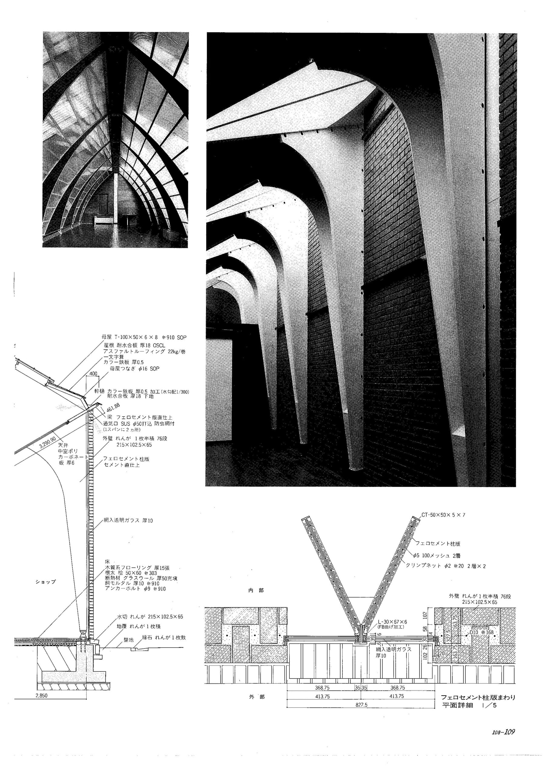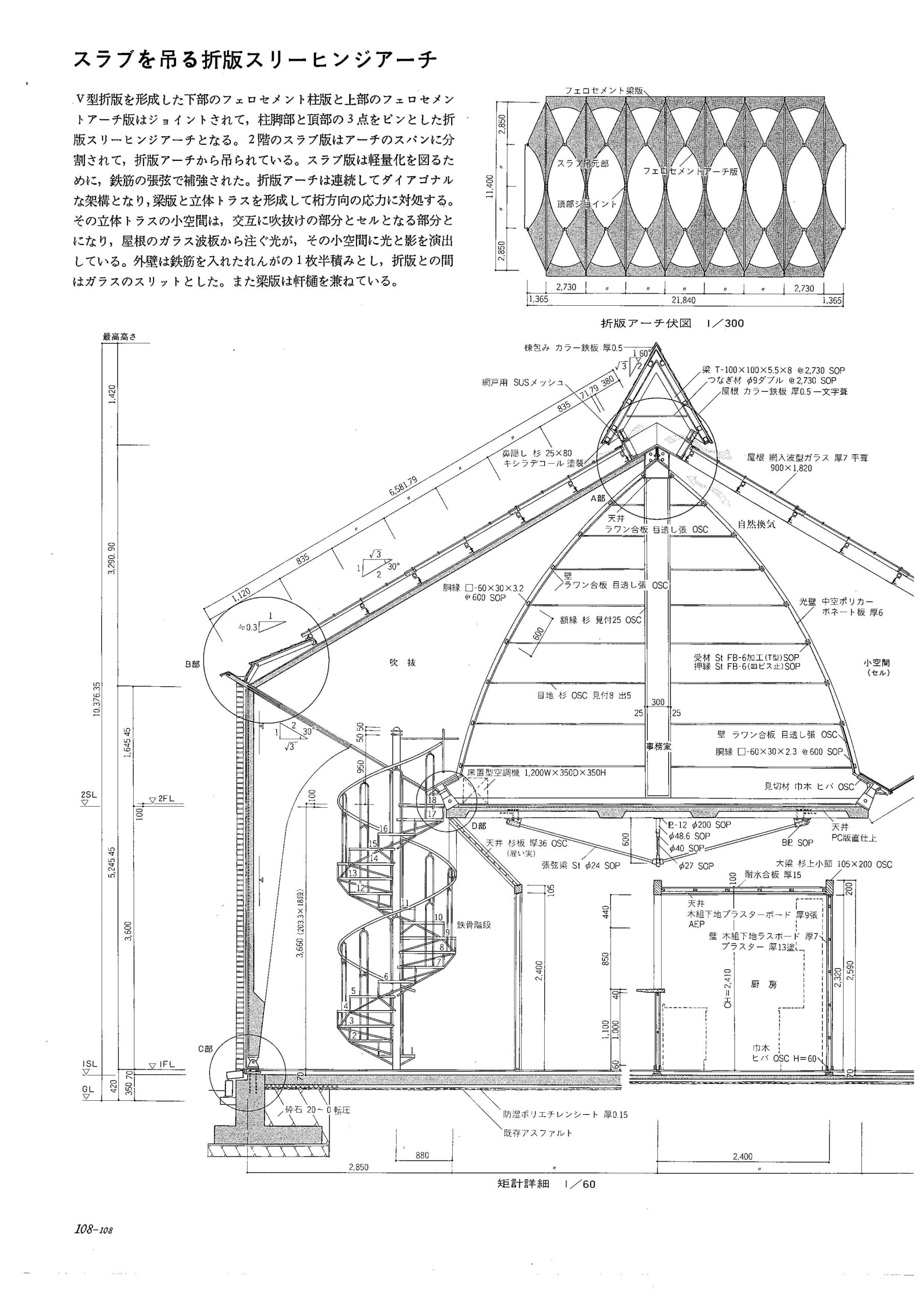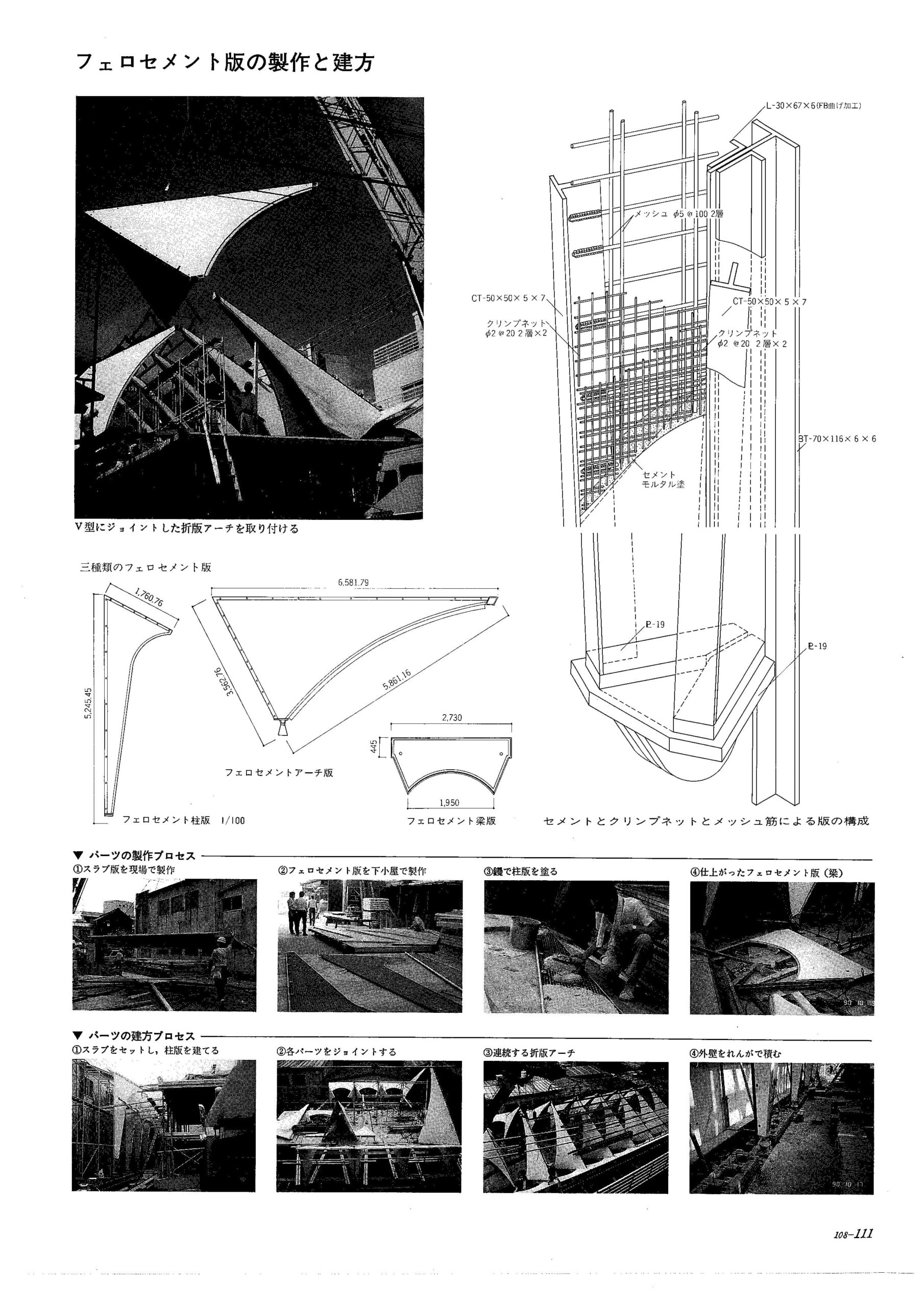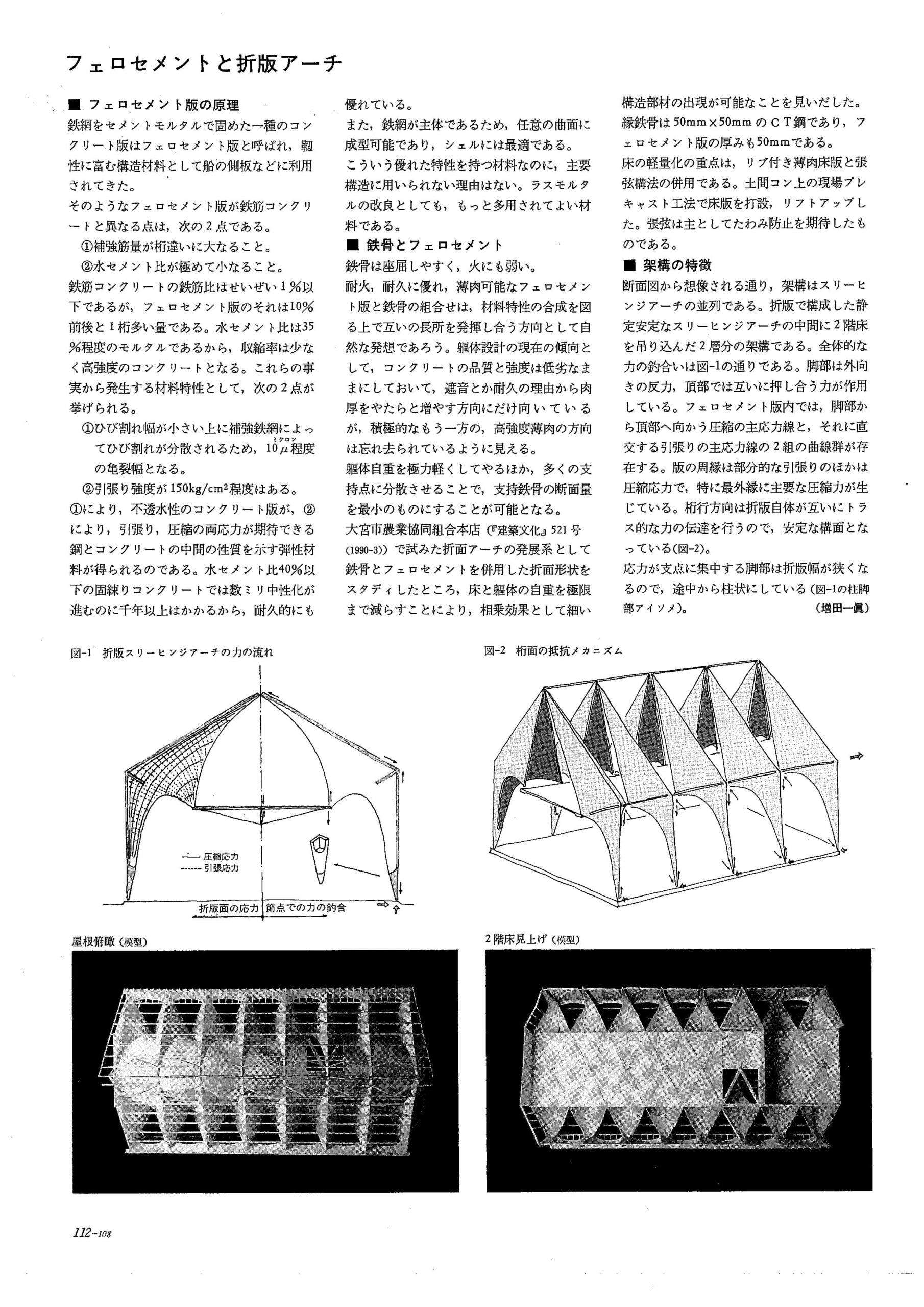 鉄網をセメントモルタルで固めたフェロセメント版は靱性に富む材料として船の側板などに利用されてきた。引張強度は150㎏/㎡程度あり、引張、圧縮の両応力が期待でき、また鉄網が主体であるため任意の局面に成型が可能である。この性質を利用して、V型折版によるスリーヒンジアーチを並列させて中間にある2階床を吊りこんだ2層分の架構である。