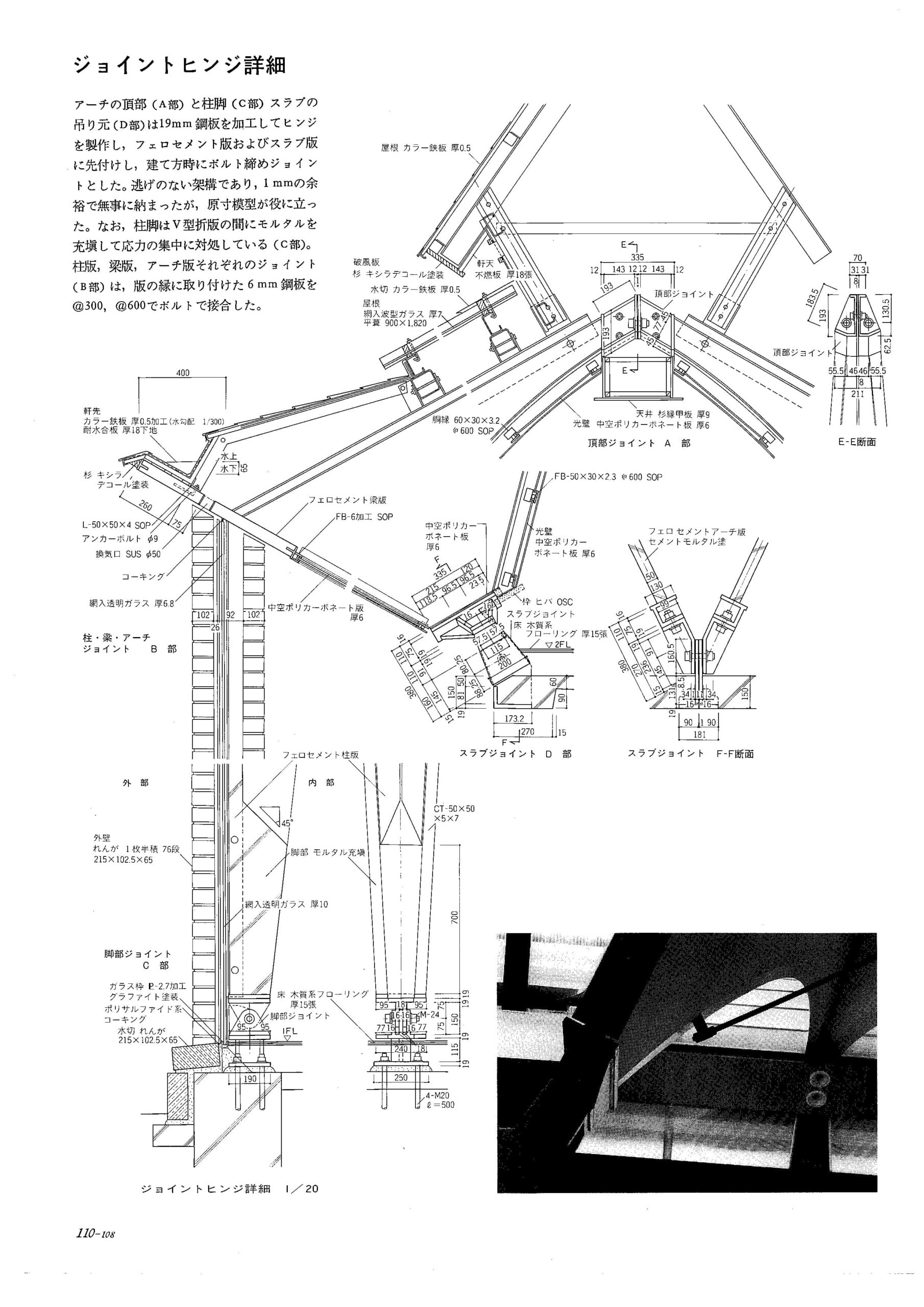 アーチの頂部(A部)と柱部(C部)スラブの吊り元(D部)は19㎜鋼板を加工してヒンジを製作し、フェロセメント版およびスラブ版に先付けし、建て方時にボルト締めジョイントとした。逃げのない架構であり、1㎜の余裕で無事納まったが、原寸模型が役に立った。なお、柱脚はV型折版の間にモルタルを充填して応力の集中に対処している(C部)。柱版、梁版、アーチ版それぞれのジョイント(B部)は、版の縁に取り付けた6㎜鋼板を@300、@600でボルトで接合した。