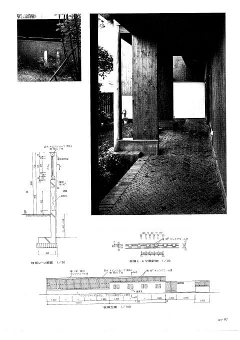 各空間を囲む壁と開口部は木質として、檜板張り、木製加茂サッシュ(既製品)を使用し、軒樋も隠し樋として木部の一部とした。とりわけ板塀は、小さな庭を取り囲み、樹木と同化する小宇宙の形成を期待する願望である。視線の遮断と風の通過には配慮したディテールとしたが、透けた板塀は外から庭の緑を垣間見させ、床のれんがとともに、町並みの景観に浸透して和やかさを与えている。