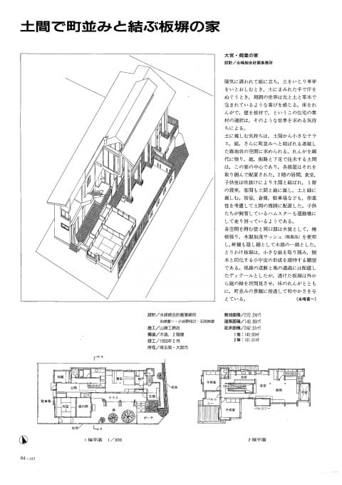 土に親しむ気持ちは、土間から小さなテラス、庭、さらに町並みへと結ばれる連続した路地状の空間に求められる。れんがを網代に張り、庭、路地と下足で往来する土間は、この家の中心であり、各部屋はそれを取り囲んで配置された。2階の居間、食堂、子供室は吹抜けにより土間と結ばれ、1階の寝室、客間も土間と庭に面し、土と緑に親しむ。浴室、倉庫、駐車場なども、作業性を考慮して土間の周囲に配置した。子供たちが飼育しているハムスターも運動場にして走り回っているようである。