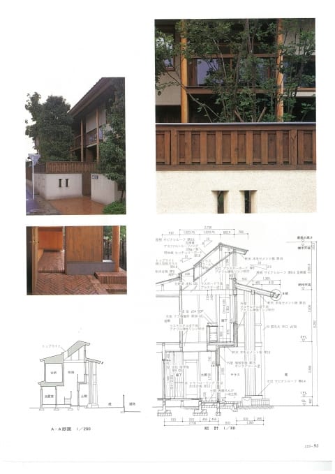 各空間を囲む壁と開口部は木質として、檜板張り、木製加茂サッシュ(既製品)を使用し、軒樋も隠し樋として木部の一部とした。とりわけ板塀は、小さな庭を取り囲み、樹木と同化する小宇宙の形成を期待する願望である。視線の遮断と風の通過には配慮したディテールとしたが、透けた板塀は外から庭の緑を垣間見させ、床のれんがとともに、町並みの景観に浸透して和やかさを与えている。