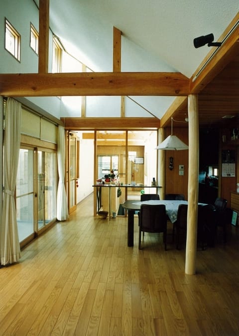 陽気に誘われて庭に立ち、土をいじり草芽をいとおしむとき、土にまみれた手で汗をぬぐうとき、周囲の世界は光と土と草木で包まれているような喜びを感じる。床をれんがで、壁を板材で、というこの住宅の素材の選択は、そのような世界を求める気持ちによる。