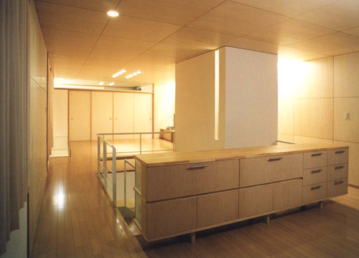 キッチンの東側窓からは、隣接する小学校の梅林をのぞめるよう計画した。低層住宅の近隣との調和を大切にしながら、木の魅力を楽しめる家となった。