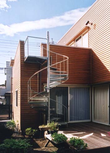 材木屋を営む家族の住宅である。木の風合いをデザインにとりいれた木造住宅で、趣味のガーデニングが楽しめる庭が欲しいとの要望があった。