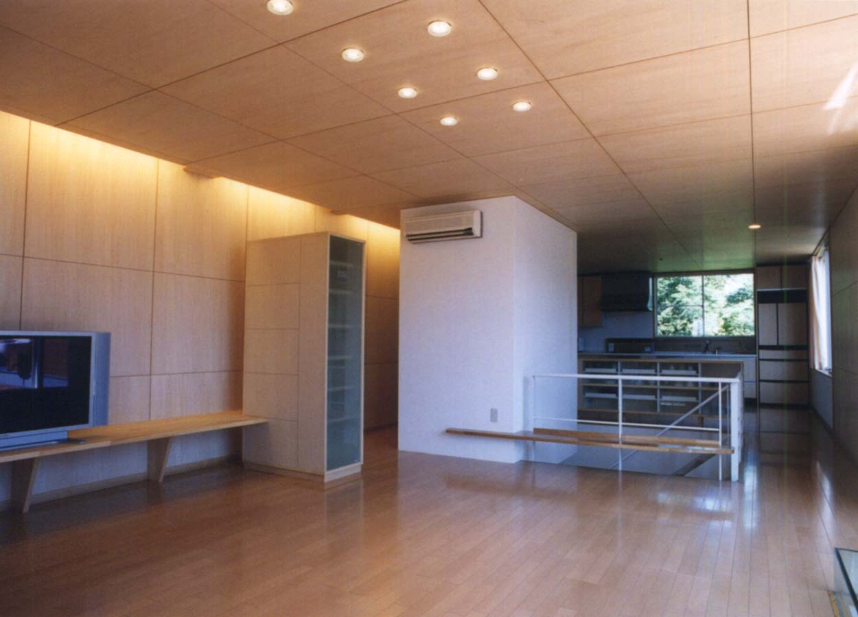 キッチンの東側窓からは、隣接する小学校の梅林をのぞめるよう計画した。低層住宅の近隣との調和を大切にしながら、木の魅力を楽しめる家となった。