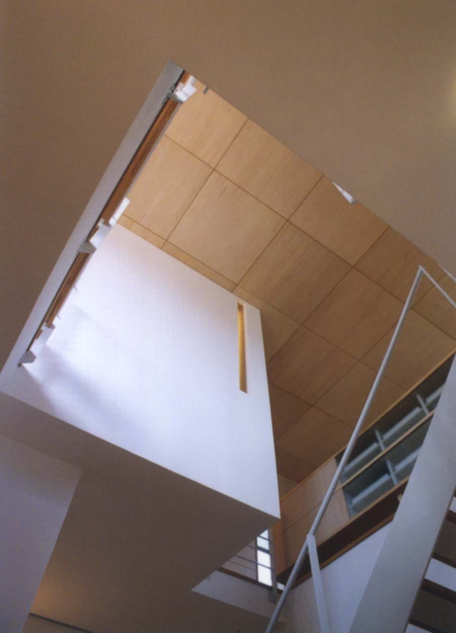 外部との連続性を大切にするため、エントランスは明確な境界を設けるのでなく、スチールの丸柱で荷重を支え、コーナーをガラスとした。また階段回りの吹き抜けの開放性を確保するため、その部分を木柱でなく、上部の梁からスチールで吊ることとした。木造を基本構造としながらも、適宜鉄骨を用い、軽やかな空間となった。