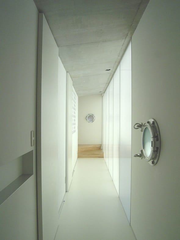 1階のエントランスから階段へとつづく廊下は、ガラス+ポリカーボネートの壁面とし光を取り入れ、明るい空間とした。