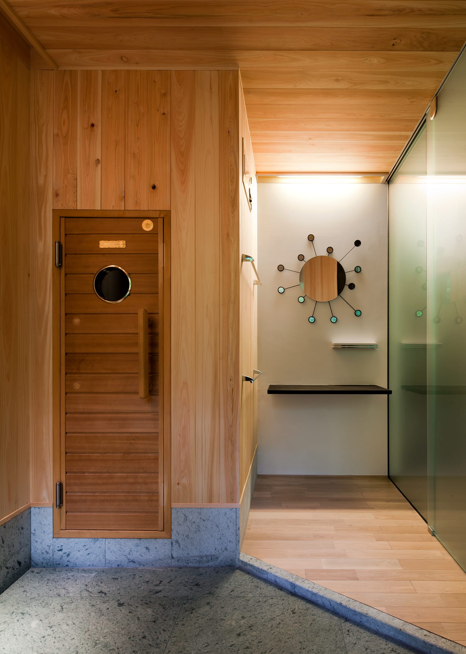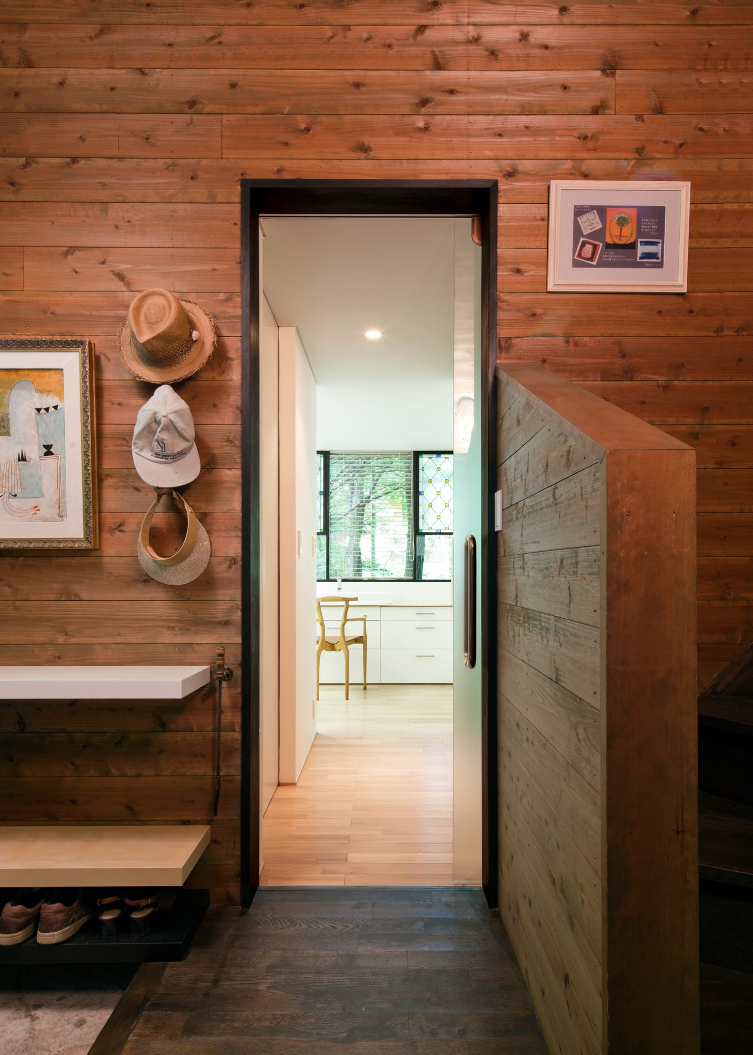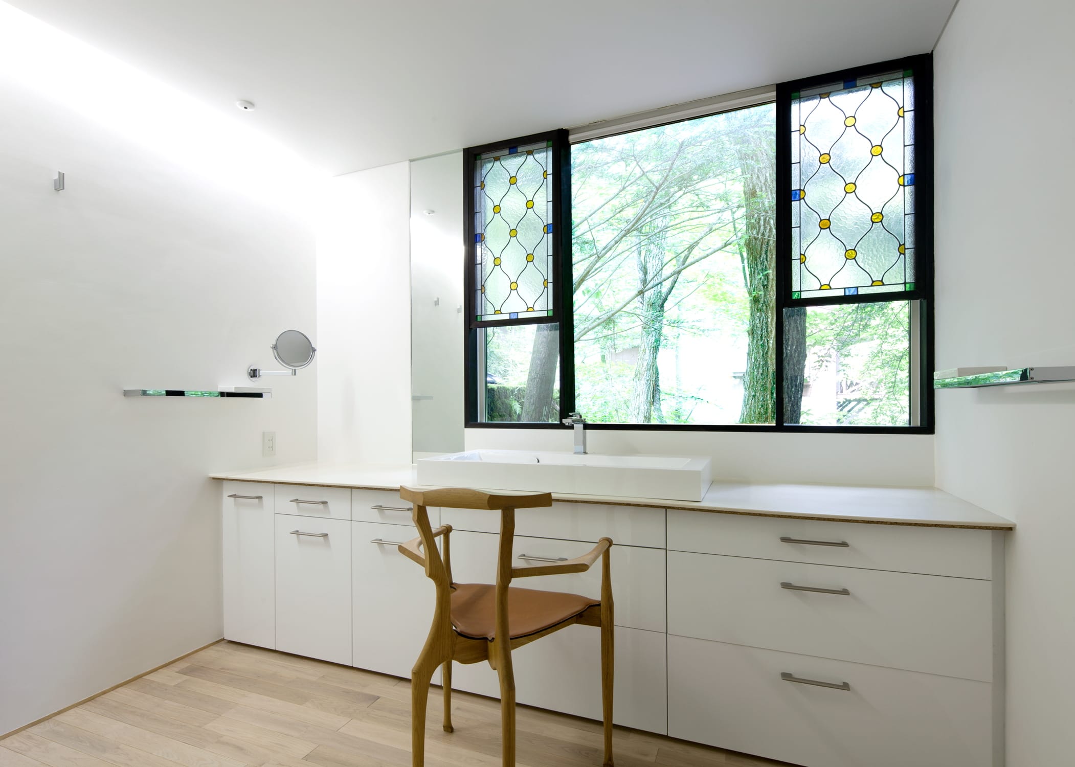 浴室内の壁は檜材、床材には水はけのよい十和田石を用いました。檜浴槽とサウナは既存のものを補修し、移設しました。洗面室には、施主が探してこられたアンティークステンドグラスを柿しぶ塗装した木枠に収めました。白い内壁は、左官仕上げです。